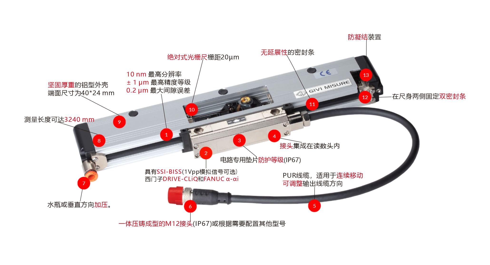 适用于数控机床的绝对式光栅尺 绝对式光栅尺采用玻璃测量结构,尤其适用于数控机床 具有SSI-BISS(1Vpp模拟信号可选),西门子DRIVE-CLiQ和 FANUC α-αi 分辨率可达10 nm 精度等级可达±1 μm 通过转换模块可支持Profibus-DP, Profinet, CANopen, DeviceNet 和ModBus转换协议 无延展性的双密封条沿读数头滑动方向安装,在尺身两端固定 光栅尺内部的创新装置可防护流入的液体 特殊的密封条和液体处理装置很好的保护了光栅尺,时期免遭 加工过程中常见冷却的侵害 线性热膨胀系数为 λ = 8 x 10-6 °C-1 在高速、强加速度和振动情况下,信号仍具有高精度和稳定性 输出连接电缆可选 接头集成在读数头内 具有电源极性倒置保护和短路保护 体积小,便于安装在狭窄的空间内 可替换之前的AGS系列 可根据要求加装加压过滤系统 |